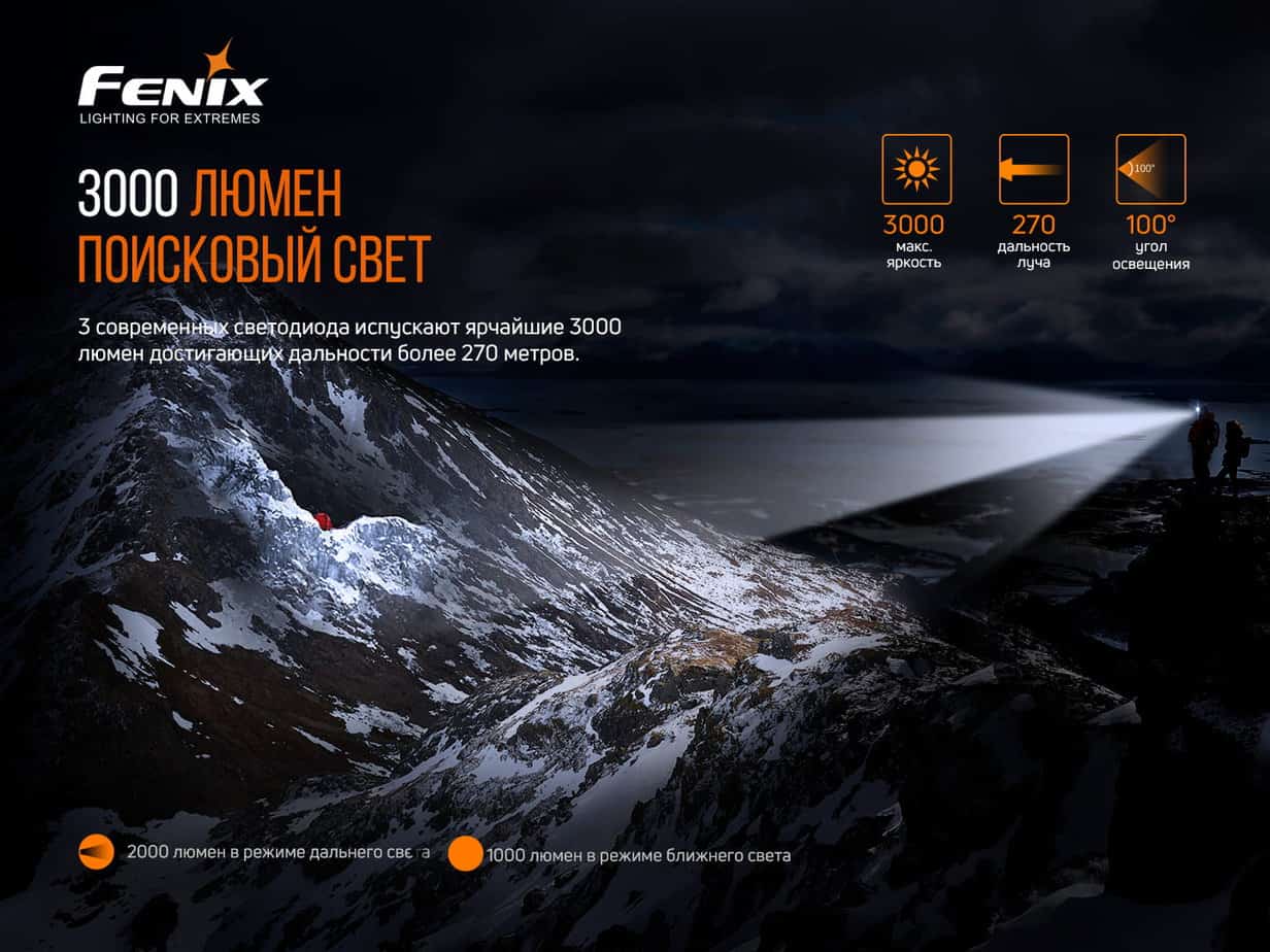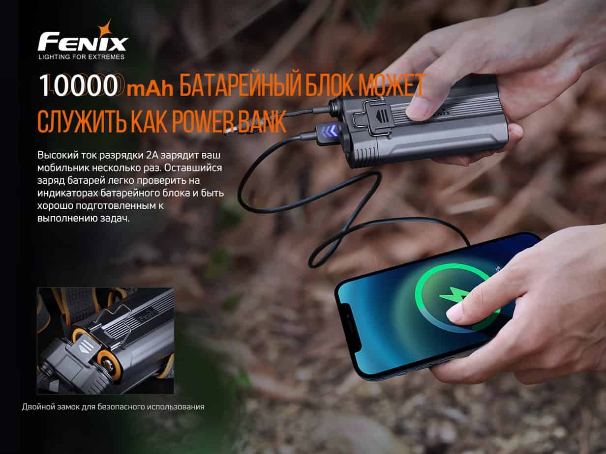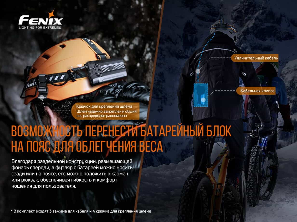 | Комплектация | Фонарь, 2 аккумулятора Fenix ARB-L21-5000 Li-ion, USB Type-C кабель для зарядки, 4 крючка для крепления на шлем, 3 клипса для кабеля, крепеж для ремня из нержавеющей стали, удлинительный кабель, запасное уплотнительное кольцо, гарантийный талон. | ||||||||||