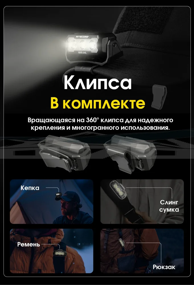 Конструкция Nitecore HA15 UHE позволяет носить его на налобной повязке, что идеально подходит для продолжительных активностей. В комплект также входит клипса, с помощью которой фонарь можно закрепить на козырьке кепки, превращая его в миниатюрный портативный осветитель.