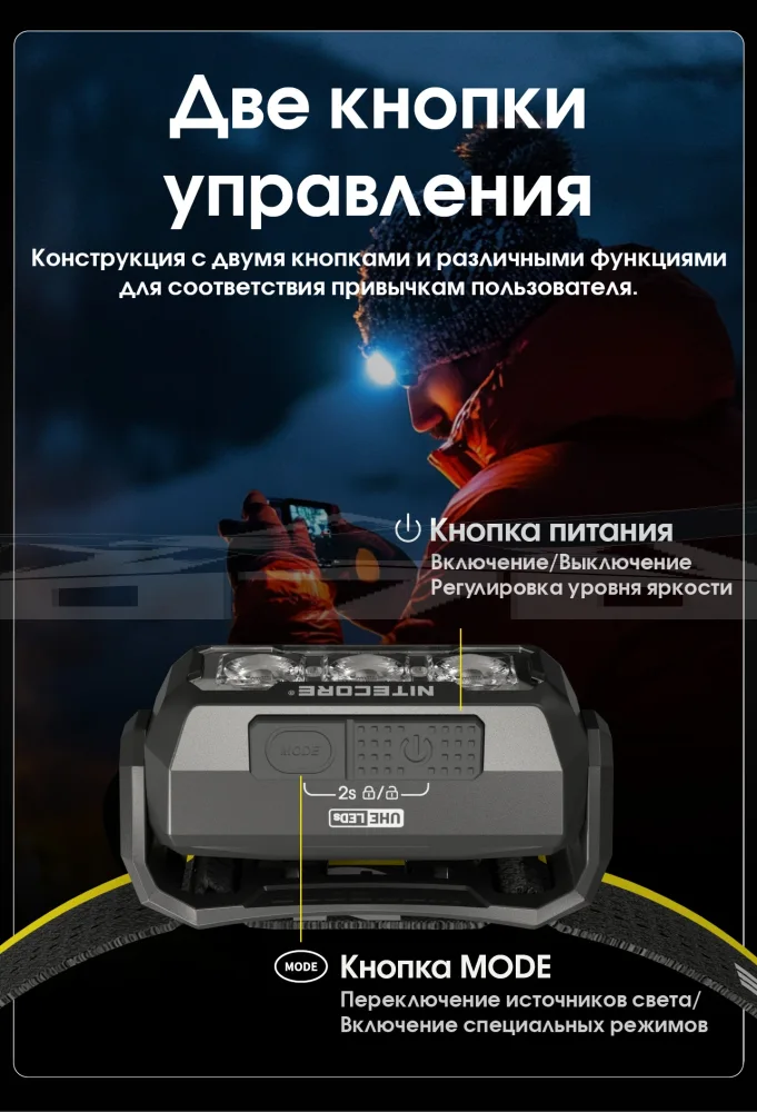 Для управления фонарем предусмотрены две кнопки, которые отличаются формой и типом нажатия. Это обеспечивает легкое управление одной рукой, даже в перчатках или при низких температурах.