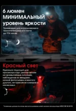 • Режимы работы: Белый свет: Высокий — 400 люмен — 3 часа 30 минут, Средний — 200 люмен — 5 часов, Низкий — 100 люмен — 10 часов 30 минут, Минимальный — 6 люмен — 114 часов; Красный свет: Высокий — 15 люмен — 10 часов, Низкий — 5 люмен — 25 часов