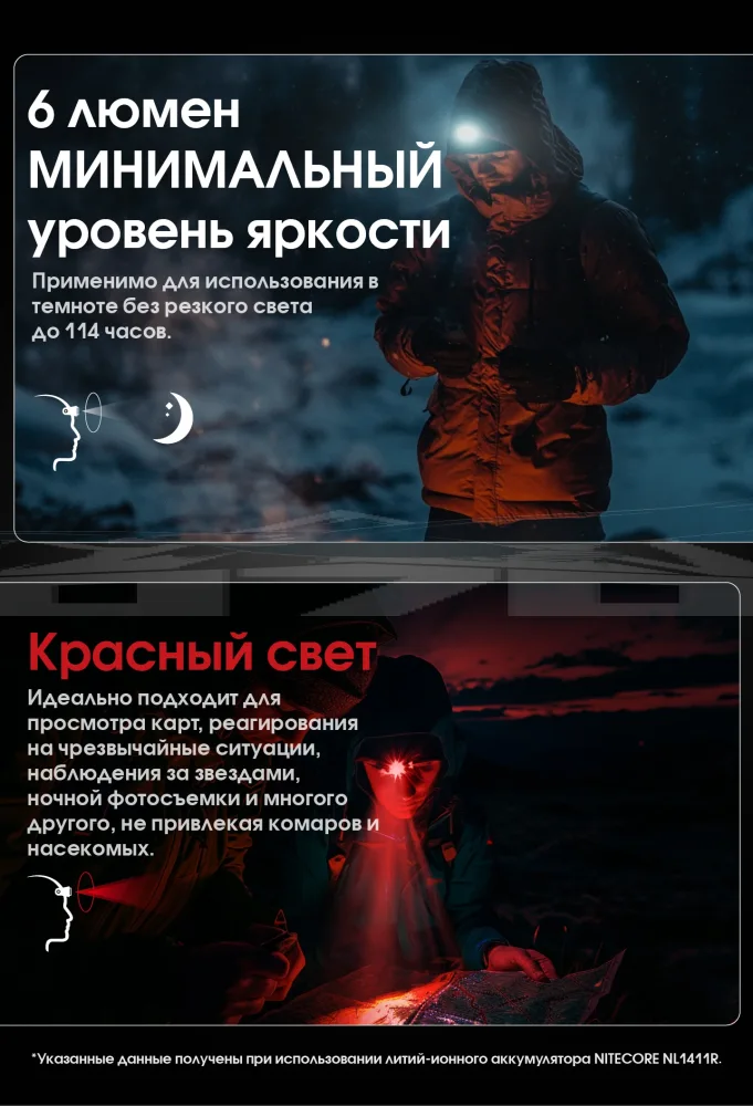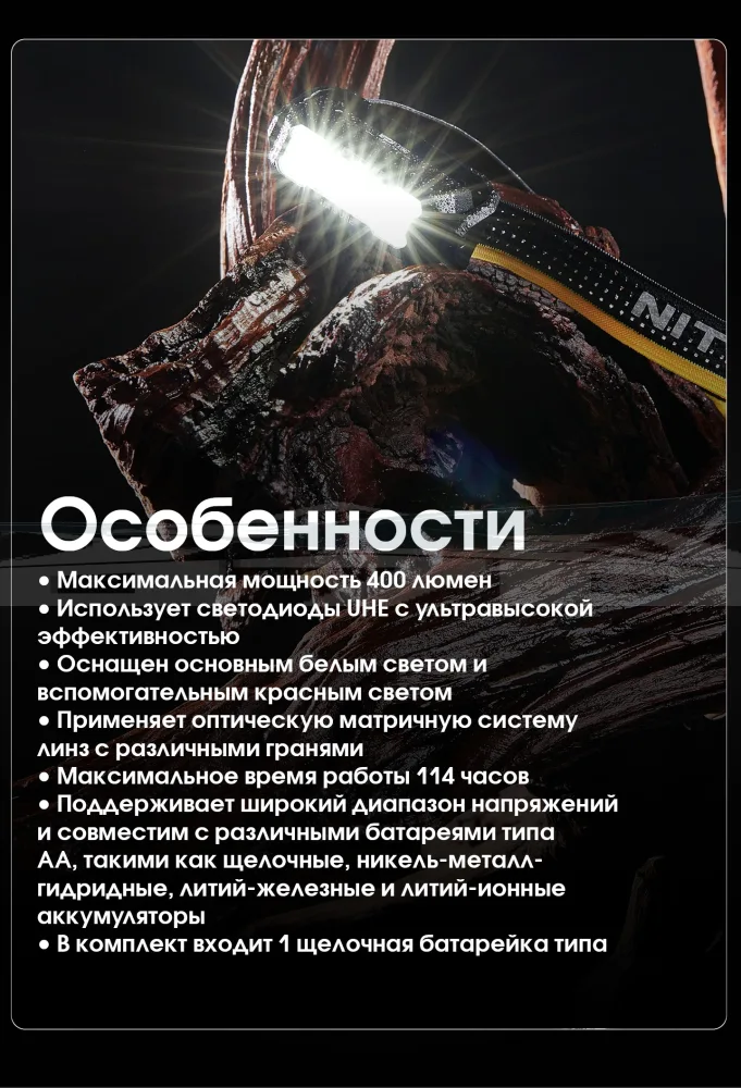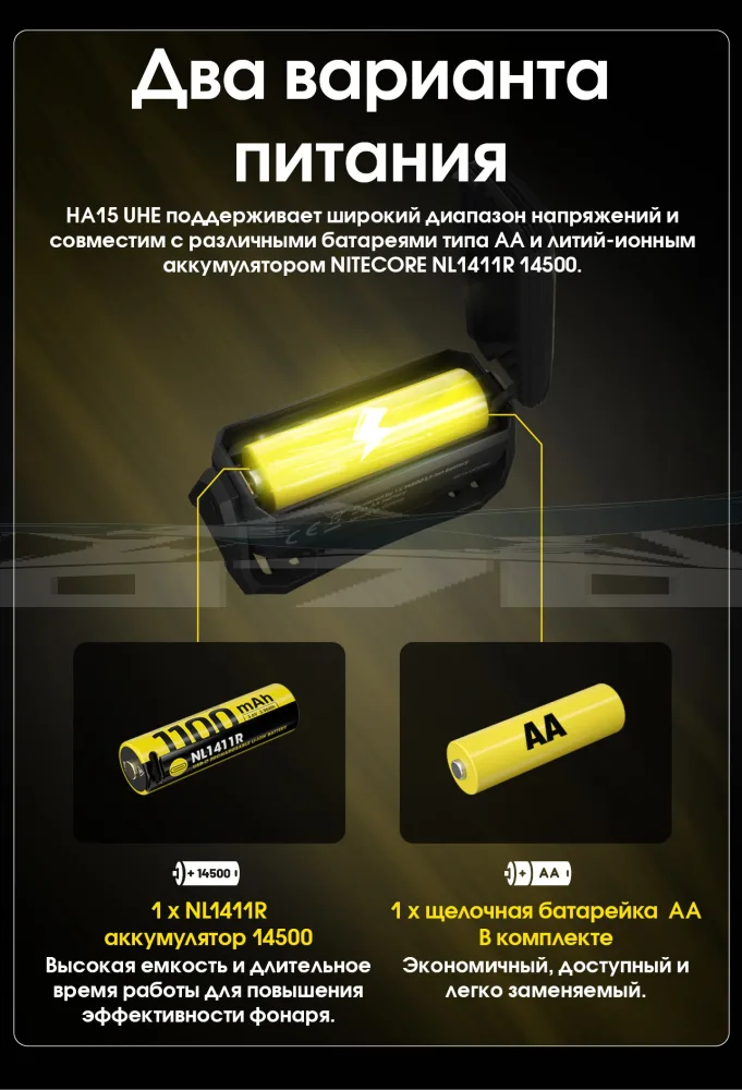 Основной особенностью Nitecore HA15 UHE является его совместимость с двумя типами элементов питания. Он поддерживает работу как от стандартных батареек AA, так и от аккумулятора Nitecore NL1411R 14500. Это обеспечивает удобство в использовании и возможность подстраиваться под разные ситуации. Например, в походе можно легко заменить разряженный аккумулятор на доступные батарейки AA, будь то щелочные, Ni-MH, литий-железные или литий-ионные.