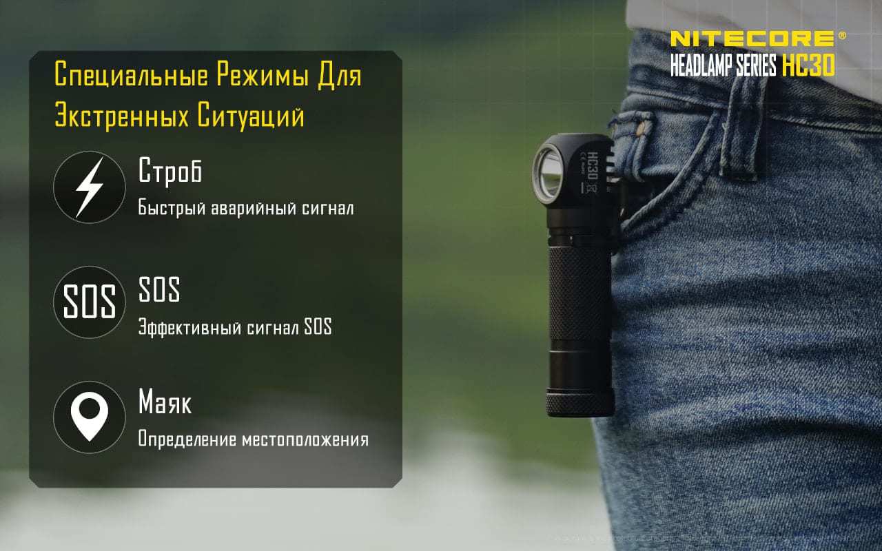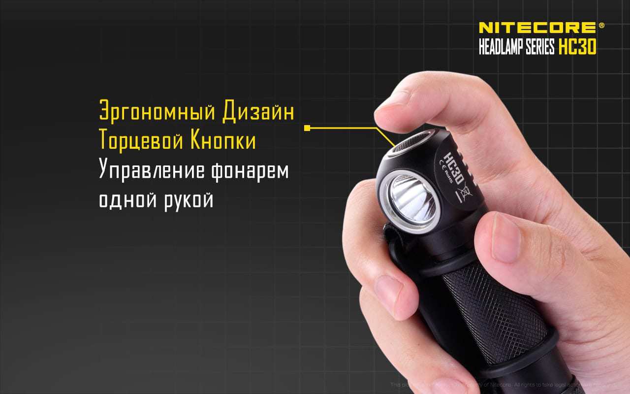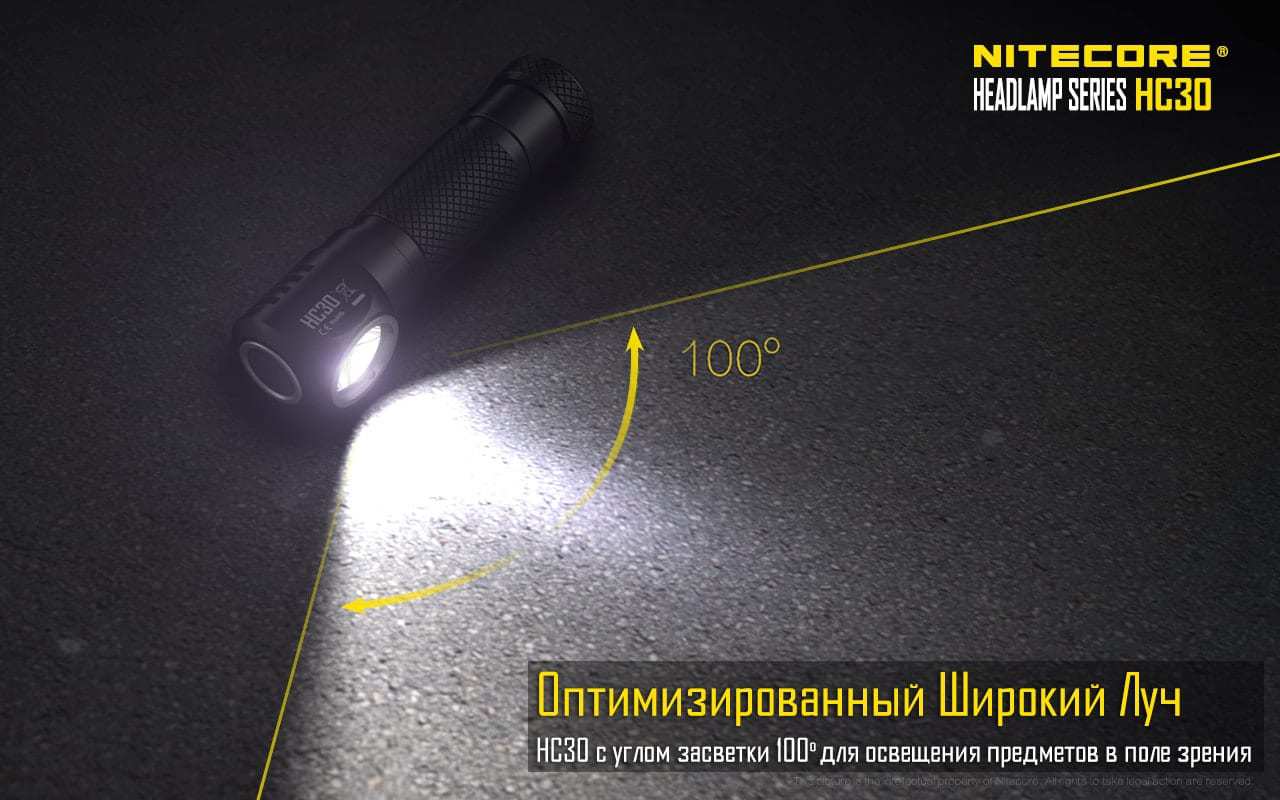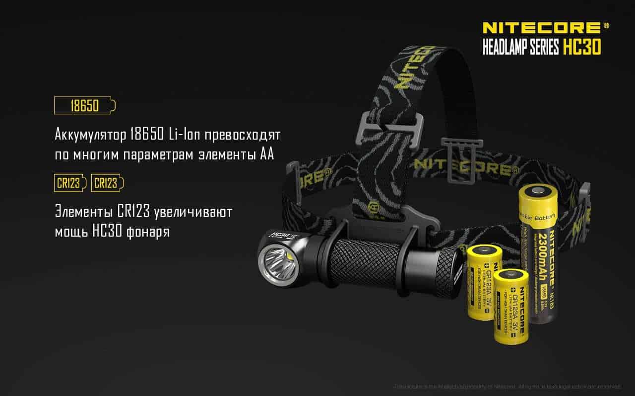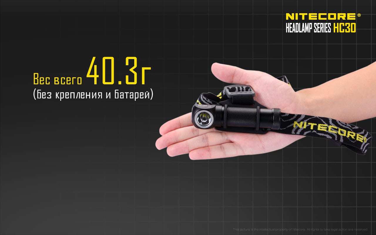 Nitecore HC30 отличается долговечностью и практичностью. Налобный фонарь очень удобен в быту, пригодится он и в полевых условиях, например, во время похода, на природе, на охоте и в многих других ситуациях, где нет стационарных источников освещения. HC30 поможет Вам не сбиться ночью с пути, либо поставить палатку в темноте. При своей мощности, компактности и качестве, станет для Вас лучшим другом. Он прост в эксплуатации. Угол засвета имеет значение — 100°. С таким освещением исключаются темные зоны перед Вами, поэтому фонарь подойдет для рыбаков, охотников, велосипедистов и любителей активного отдыха, для профессиональных целей, спелеологов и туристов. Время работы от 1х18650 или 2хCR123, в лунном режиме фонарь светит до 330 часов. Фонарь имеет прочный корпус из анодированного авиационного алюминия T6, который обеспечивает противоударность при падении с высоты 1,5 метров.