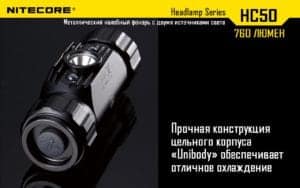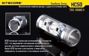 - Корпус фонаря HC50 изготовлен из цельного куска аэрокосмического алюминиевого сплава «Unique Integrated Technology» (UIT), что обеспечивает для HC50 максимальную прочность, надежность, выносливость, а так же намного лучший теплоотвод и охлаждение ядра фонаря по сравнению с использованием пластика или сборных алюминиевых частей при изготовлении корпуса.