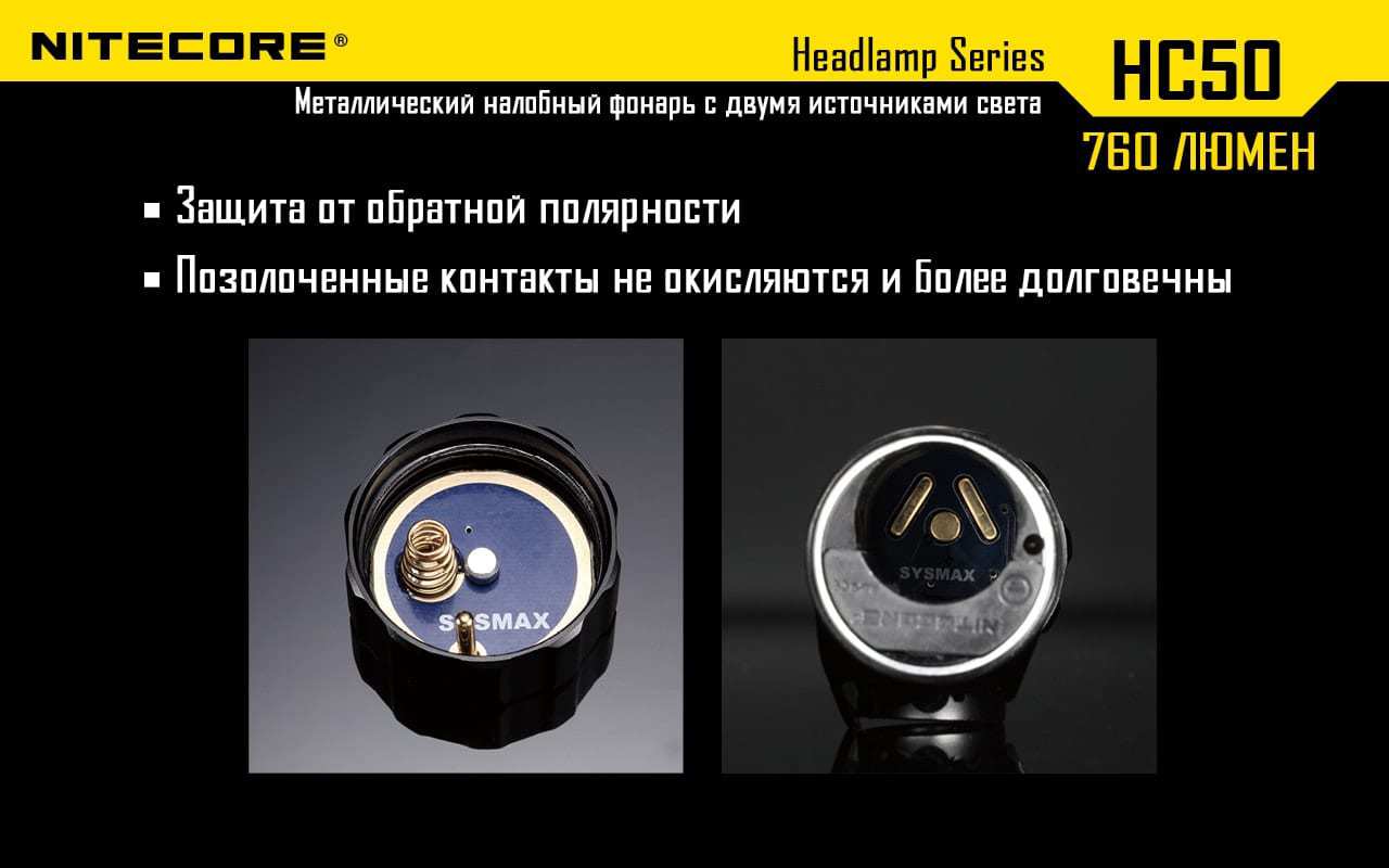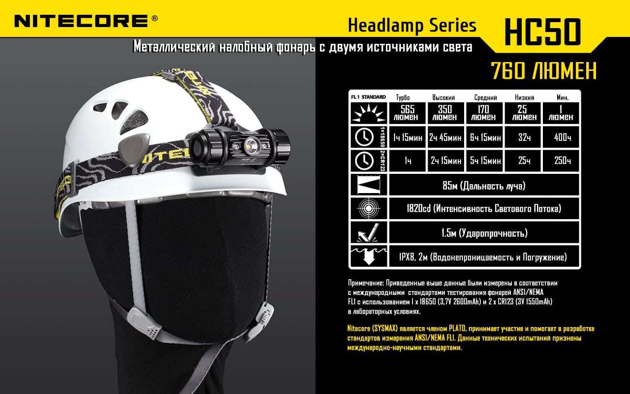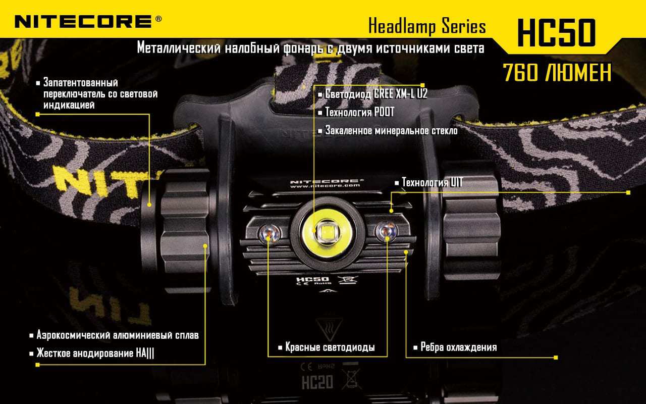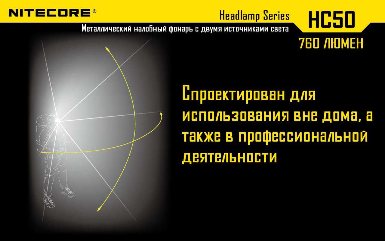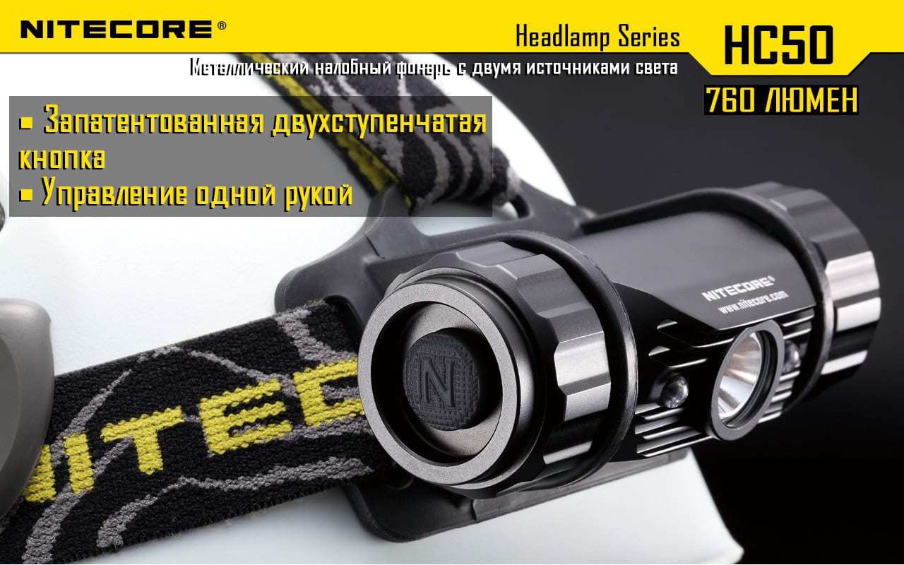 Это инновационный налобный фонарь нового поколения достойный Вашего внимания. Новый налобный фонарь от компании Nitecore с яркостью в 760 реальных люмен способен освещать расстояние до 98 метров впереди своего пользователя и это с невероятно широкой боковой засветкой 100°! Фонарь Nitecore HC50 отличается легкостью, надежностью и возможностью длительного использования без подзарядки. Использование американского светодиода Cree XM-L U2 так же позволяет «выжимать» из этого налобного фонаря максимум! Благодаря своим характеристикам и качеству его можно с уверенностью купить для любых возможных мероприятий в жизни.