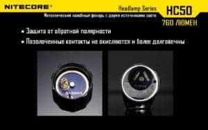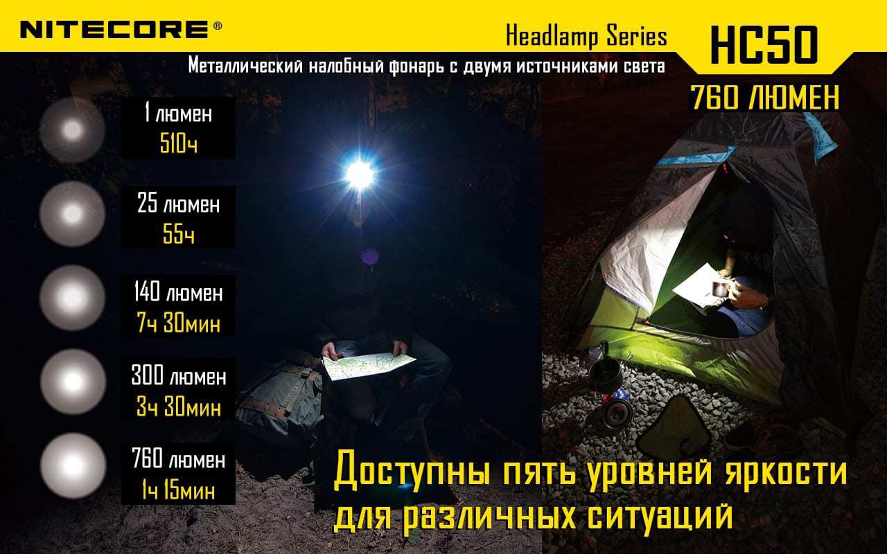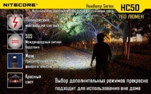 - Режимы работы. 10-десять разнообразных режимов работы фонаря (из них 5 режимов яркости), способны удовлетворить даже самого требовательного пользователя и покрывают, своими характеристиками все возможные варианты применения налобника Nitecore HC50.