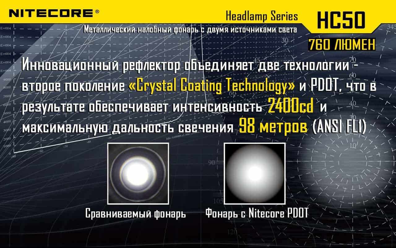 - Инновационный рефлектор фонаря вместе с запатентованной технологией второго поколения «Crystal Coating Technology» и известной технологией «PDOT» от Nitecore, позволили получить максимальную интенсивность света 2400cd и дальность потока до 98 метров (ANSI FL1)