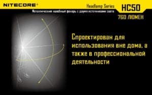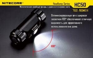 - Оптика HC50 оптимизирована под широкую засветку — угол светового потока 100°. Такая засветка позволяет использовать фонарь для любых задач, т.к. ближайшее пространство вокруг освещается полностью. Широкая засветка наиболее удобна в использовании для налобных фонарей.