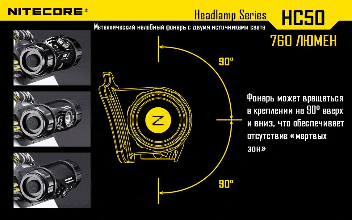 Благодаря уникальной технологии, угол лучевого света налобного фонаря просто не оставляет шанса мертвым зонам вокруг владельца налобника из-за крайне широкого радиуса света луча в 100°, а возможность изменения положения корпуса по вертикали в 180° позволяет мгновенно осветить необходимый Вам участок полностью исключая «мертвые зоны».