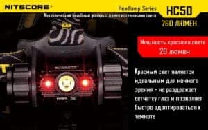 - Режим «Ночное зрение». Фонарь Nitecore HC50 так же оснащён двумя яркими красными светодиодами (расположенными по бокам от основного Cree XM-L U2). Красный свет предназначен для использования на небольших расстояниях ночью — для минимальной дезориентации и травмирования человеческого глаза. Красный свет так же позволит Вам минимально тревожить окружающих людей (например: при включении фонаря в палатке, автомобиле или закрытом помещении).