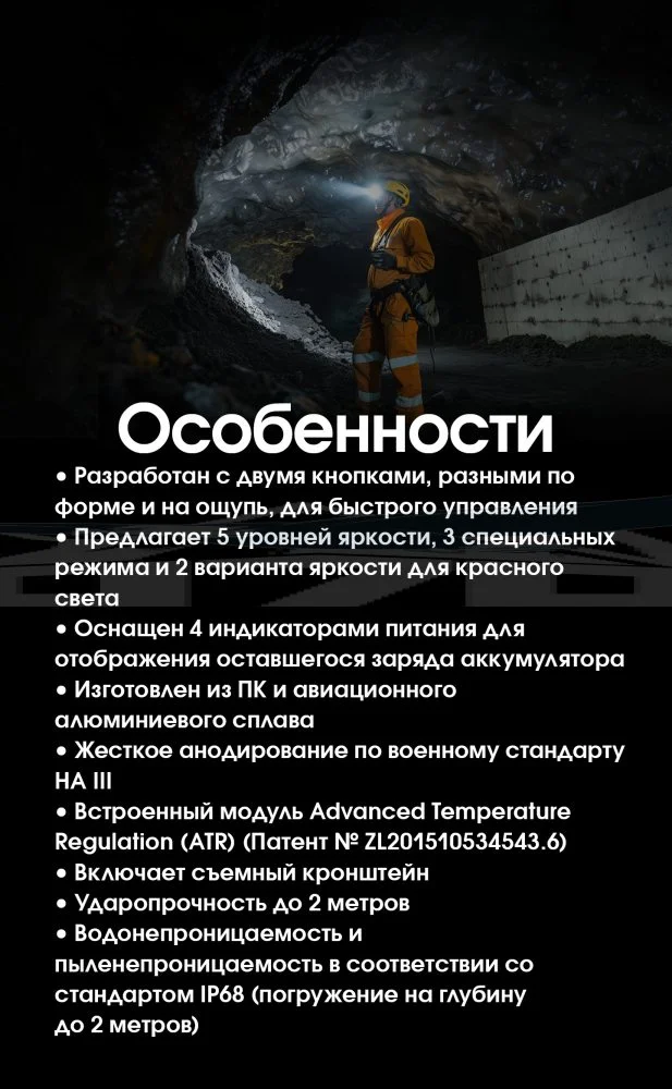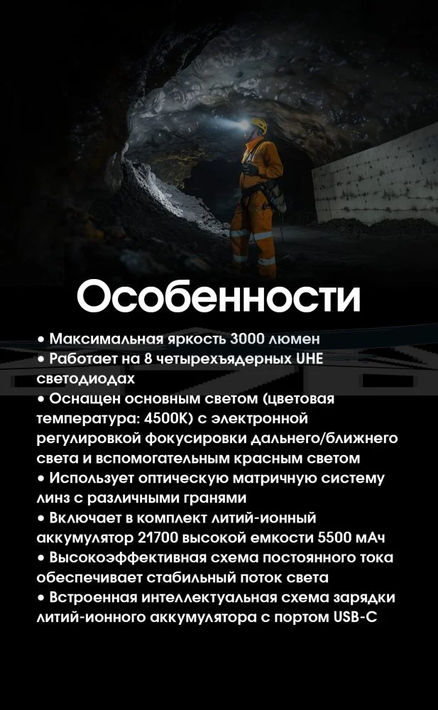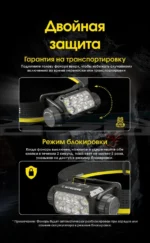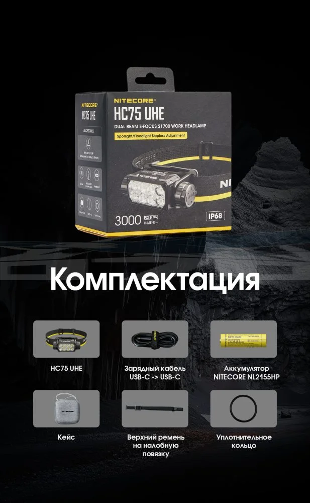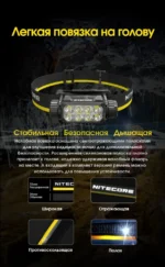 - Комплектация: Фонарь, аккумулятор Nitecore NL2155HP (5500mAh), кабель для зарядки USB-C — USB-C, крепление, налобная повязка, верхний ремень для повязки, кейс, уплотнительное кольцо, фирменная коробка