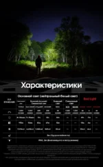 - Режимы работы: Турбо — 3000 люмен — 4 часа 30 минут, Высокий — 1500 люмен — 7 часов 15 минут, Средний — 600 люмен — 12 часов, Низкий — 200 люмен — 32 часа, Минимальный — 40 люмен — 84 часа, Красный Высокий (постоянный) — 30 люмен — 41 час, Красный Низкий (постоянный) — 5 люмен — 73 часа