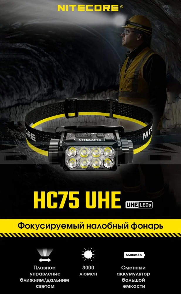 Фонарь налобный Nitecore HC75 UHE (8xNiteLab UHE LED, 3000 люмен, 10 режимов, 1×21700, USB-C)