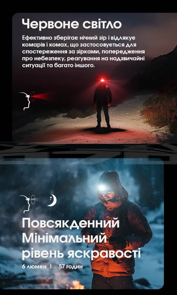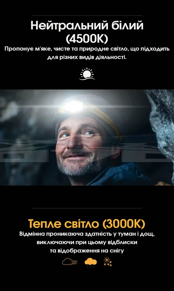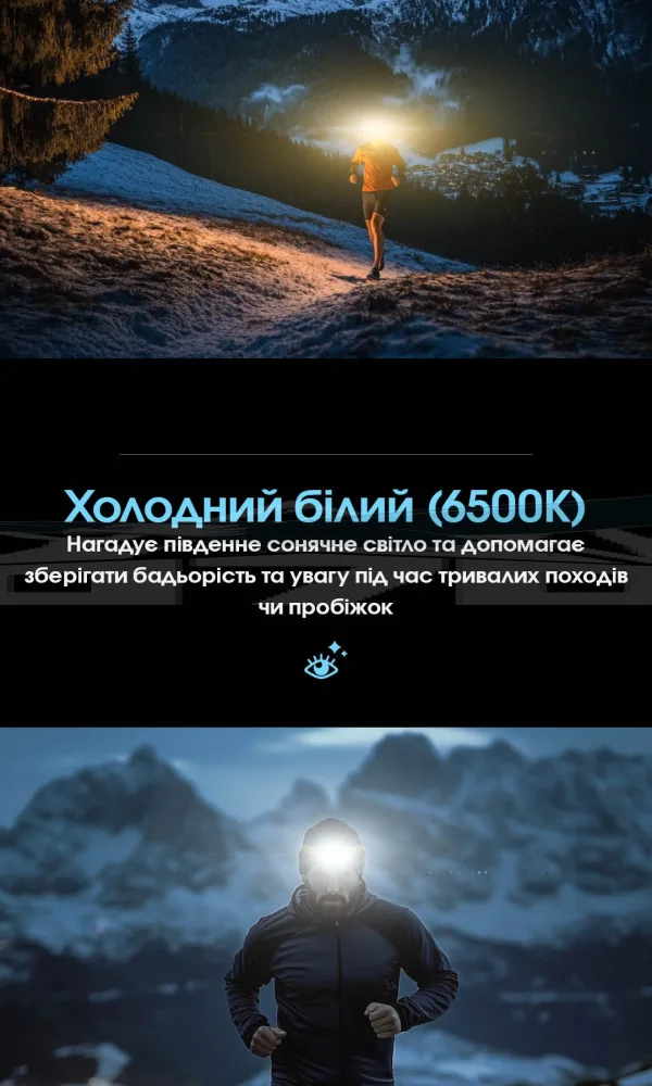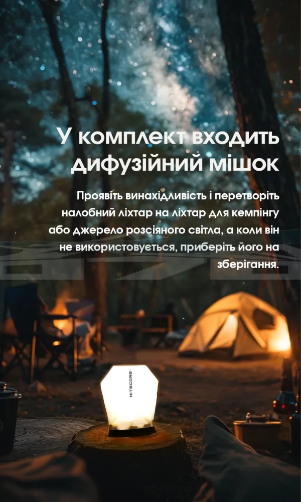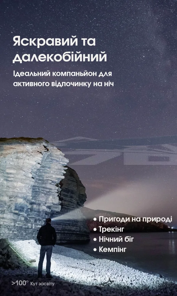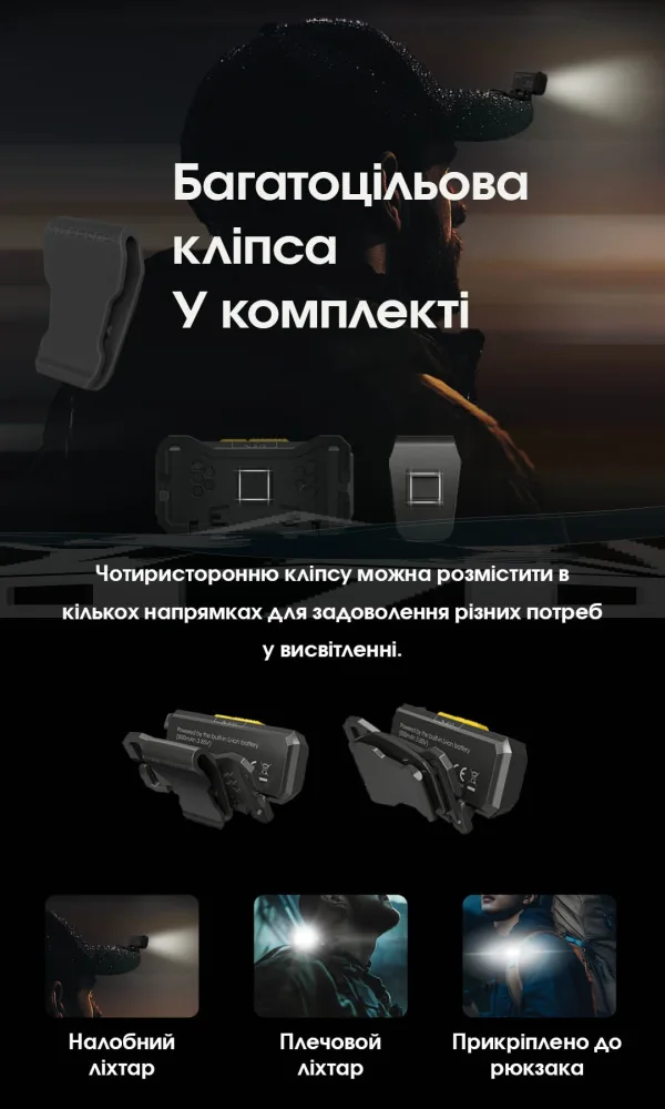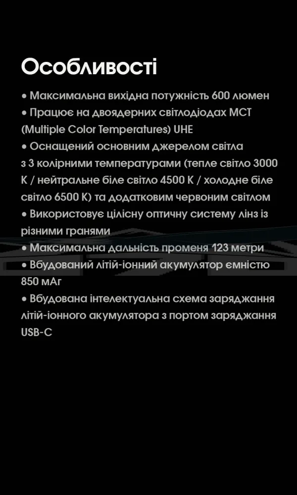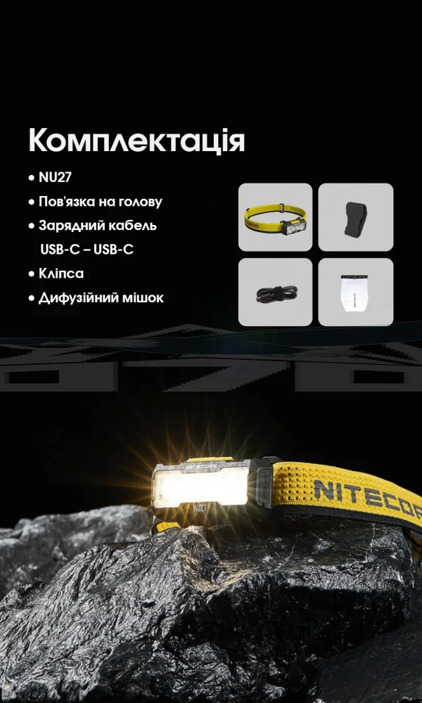 - Комплектация: Фонарь, налобная повязка, кабель для зарядки USB-C — USB-C, клипса, диффузионный мешок, фирменная упаковка