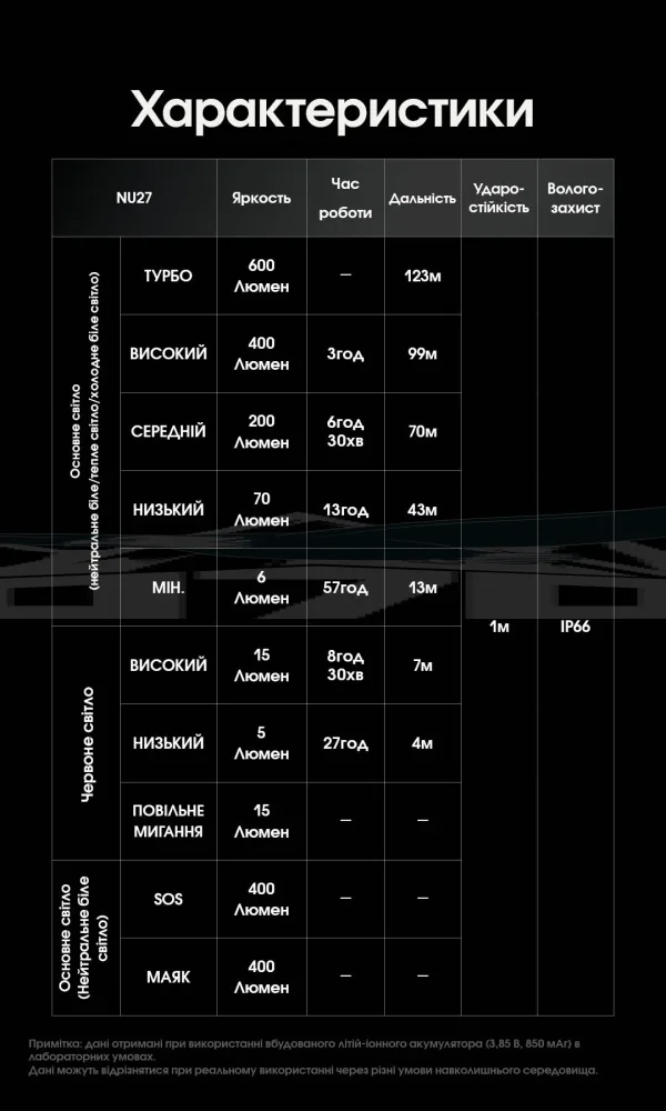 - Режимы работы: Основной белый свет (Нейтральный/Холодный/Теплый): Турбо — 600 люмен, Высокий — 400 люмен — 3 часа, Средний — 200 люмен — 6 часов 30 минут, Низкий — 70 люмен — 13 часов, Минимальный — 8 люмен. часов 30 минут, Низкое – 5 люмен – 27 часов