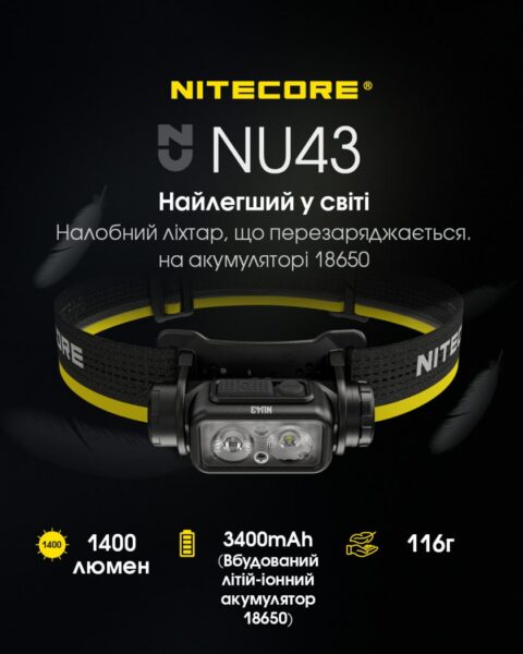 Фонарь налобный Nitecore NU43 (Белый + Красный LED, 1400 люмен, 9 режимов, 1×18650, USB-C, датчик приближения)