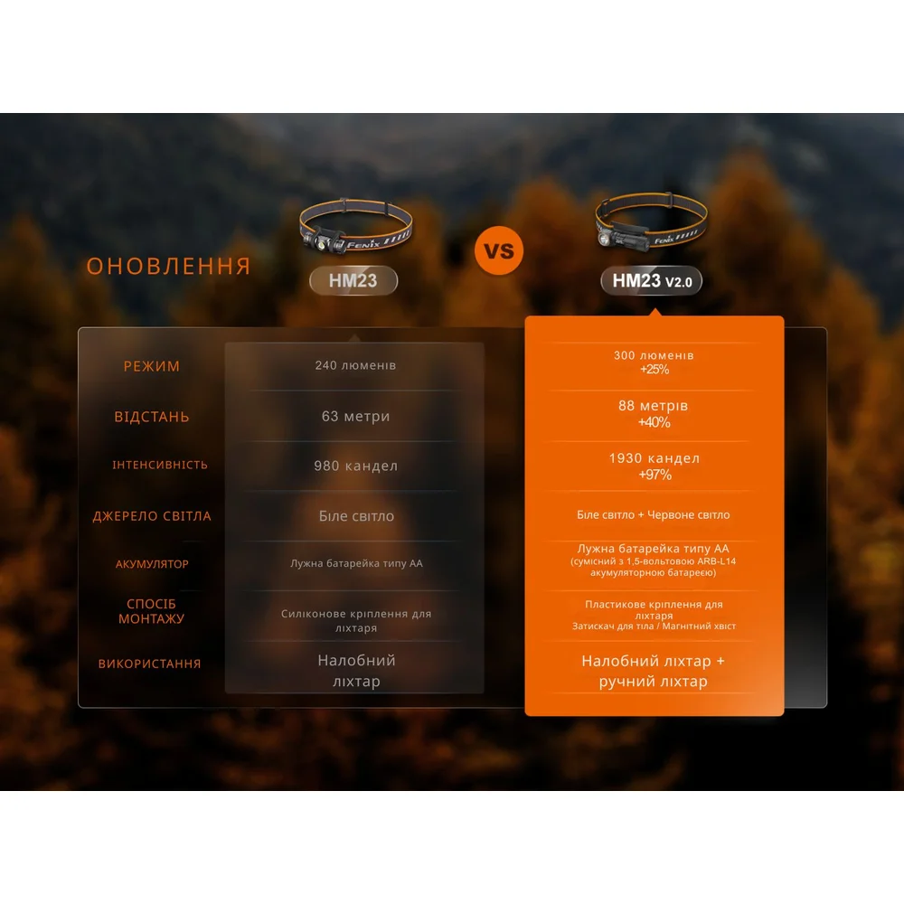 HM23 V2.0 питается от одной батареи AA , которая идет в комплекте. Фонарь также совместим с перезаряжаемым аккумулятором Fenix ARB-L14-U типоразмера 14500 (1.5 В).