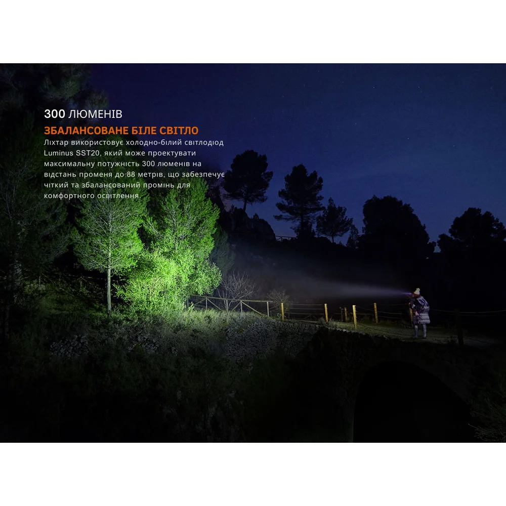 Сочетание одного белого светодиода Luminus SST20 и двух красных 2835 делает фонарь актуальным не только для повседневной эксплуатации, но и профессиональных тактических целей. Белый свет яркостью до 300 лм (цветовая температура 5900–6500К) дает подробное освещение на дистанции 88 м, а цветной красный луч обеспечивает мягкую подсветку с сохранением ночного зрения.