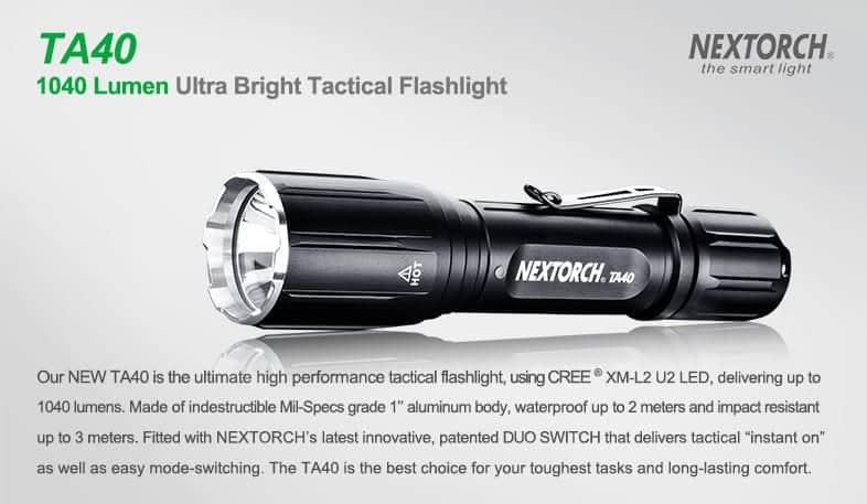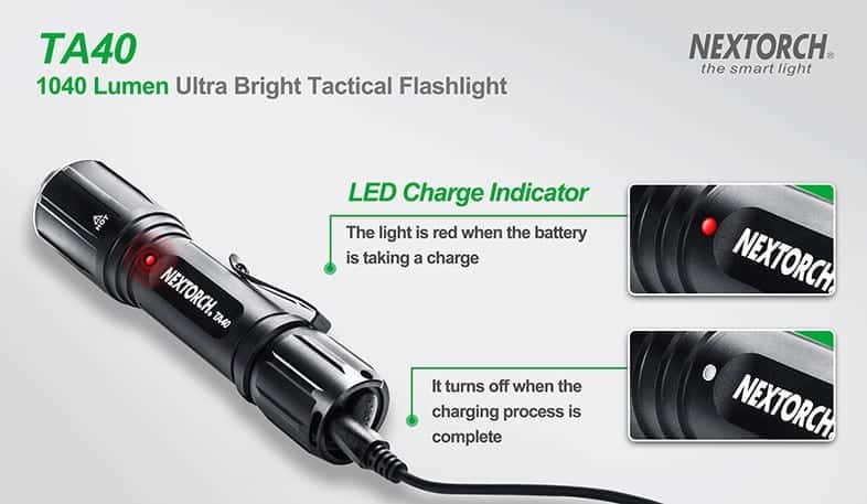 Фонарь Nextorch TA40 можно с уверенностью назвать «монстром» тактической серии фонарей Nextorch. Он обладает мощным световым потоком в размере 1040 люмен! При достаточно компактных габаритных размерах и весе 124 грамма без элемента питания. Яркий световой поток обеспечивает светодиод Cree XP-L2 U2. Работу фонаря может обеспечивать два типа элементов питания: 1×18650 или 2xCR123A. Уникальной особенностью является возможность заряжать фонарь через скрытый USB порт. Индикация заряда позволяет контролировать статус зарядки фонаря, при полном заряде индикация подсвечивать не будет, он горит только во время зарядки.