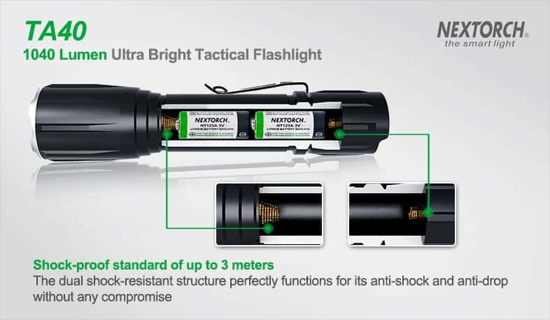Любая стихия будет по плечу фонарю TA40. Он обладает защитой от проникновения воды, вы сможете нырять с ним на глубину до 2-х метров. Что касается ударопрочности, то она составляет 3 метра. Бросать фонарь о бетонные стены, конечно, не стоит, но если он случайно упадет с высоты до 3-х метров – вам не стоит беспокоиться. Надежный корпус и эргономичность фонаря проявит себя как нельзя лучше в любых экстремальных ситуациях.