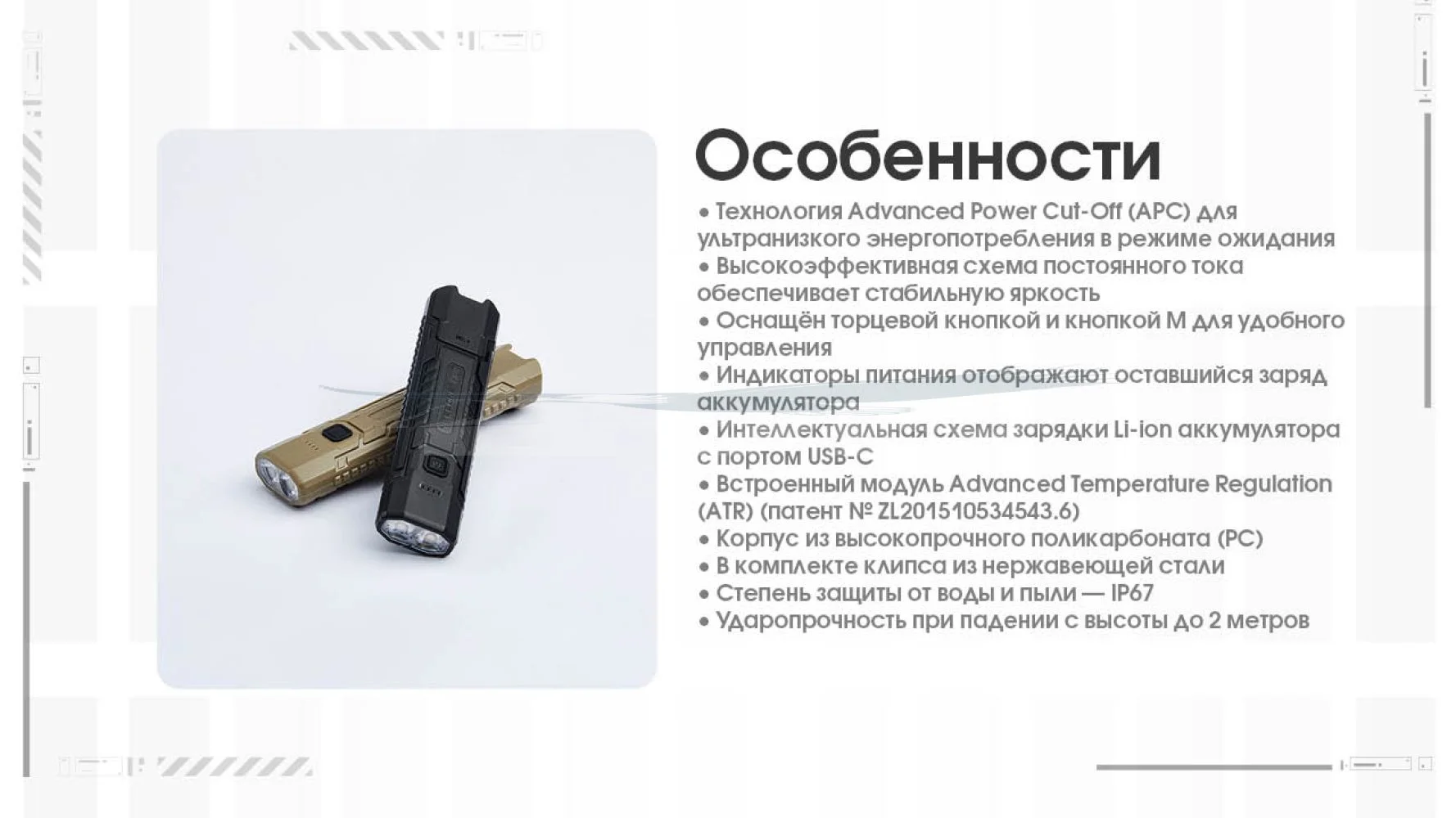 - Комплектация: Фонарь, темляк, USB-C кабель для зарядки, фирменная коробка