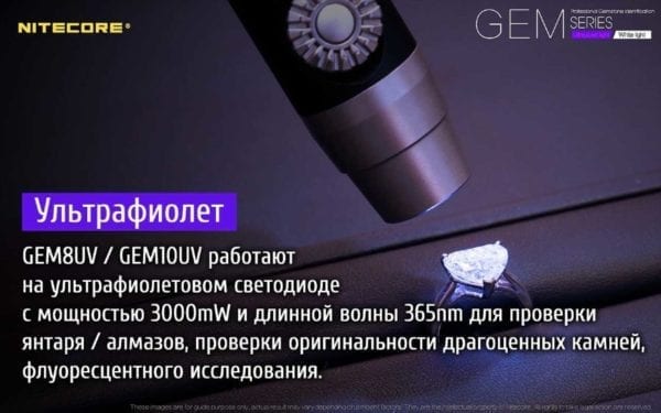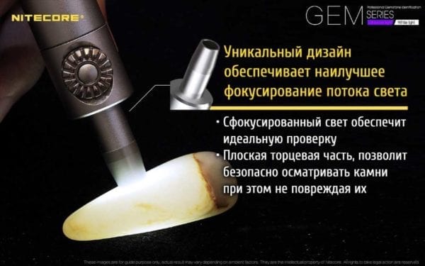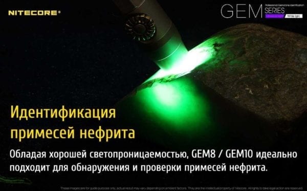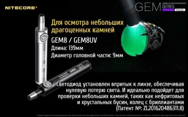 Gem 8 предназначается для профессиональной работы с драгоценными камнями. С его помощью можно проверить на натуральность и наличие деффектов все виды нефрита, а также провести экспертизу янтаря, алмазов и других ювелирных минералов. Форма корпуса этого фонаря сделана так, чтобы его было удобно держать в одной руке. Внешне он даже напоминает обычную пишущую ручку. Длина фонаря составляет 139 мм, а диаметр в районе головной части — 9 мм.