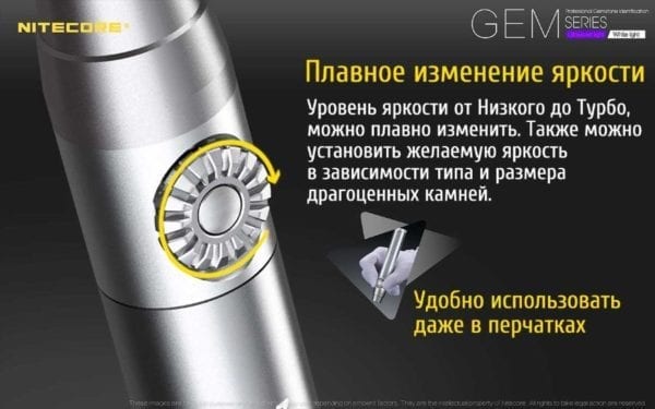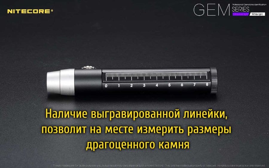 Еще одним залогом надежности данного фонаря является то, что корпус для него сделан из алюминия. Он прочный, не ржавеет, совсем не пропускает воду (фонарь гидроизолирован согласно стандарту IPX-8). А для удобства работы с драгоценными камнями, на корпус нанесена точная измерительная шкала.