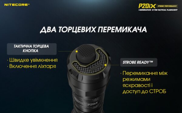- Два торцевых переключателя позволяют интуитивно управлять режимами работы фонаря.