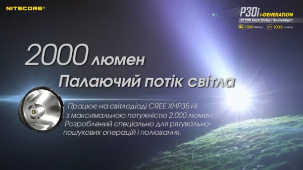 • Работает на светодиоде CREE XHP35 HI с максимальной мощностью 2,000 люмен.