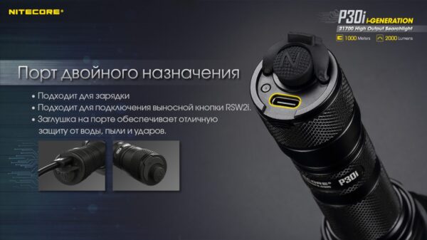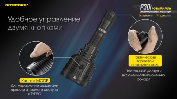 • В комплекте литий-ионный аккумулятор NITECORE 21700 (NL2150HPi 5000 mAh) и выносная кнопка (RSW2i)