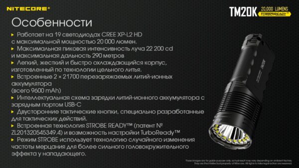 - Работает на 19 светодиодах CREE XP-L2 HD с максимальной мощностью 20000 люмен.
