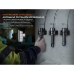 За прочное удержание фонаря отвечает мелкая накатка, предотвращающая скольжение конструкции в руке даже при ношении плотных перчаток. Крепление в хвостовой части позволяет фиксировать модель на поясе или подвешивать крючок для удобного хранения.