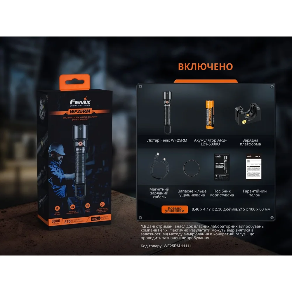 Фонарь Fenix WF25RM, аккумулятор Fenix ARB-L21-5000U, магнитный кабель для зарядки, держатель для зарядки, запасное уплотнительное кольцо, инструкция пользователя, гарантийный талон.