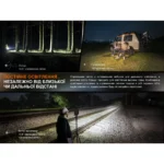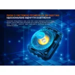 Фонарь работает на базе светодиода Luminus SST20 и вспомогательного трехцветного диода COB – оба со сроком службы не менее 50000 ч, что гарантирует долговечность работы устройства. Угол луча зависит от типа выбранного режима: в ближнем освещении он составляет 105°, в дальнобойном – 14,5° с боковым освещением 85°, а в комбинированном – 14,5° с освещением 105°.