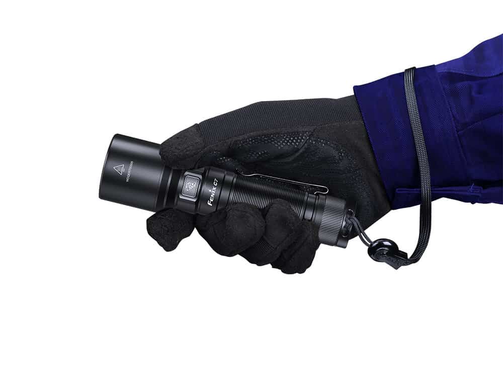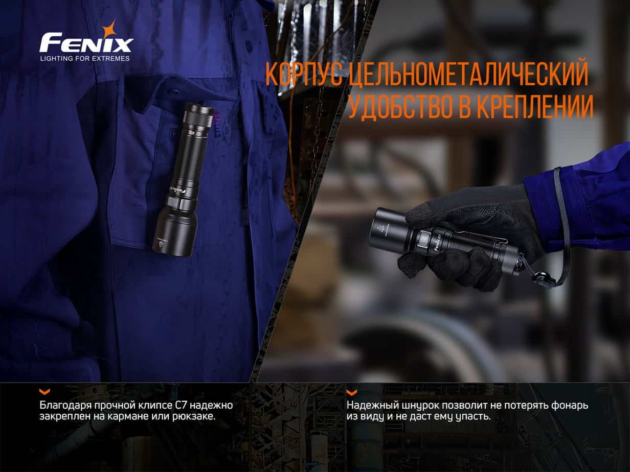 Использованный диод-Luminus SST70, срок эксплуатации которого достигает 50000 часов. Управляется модель через боковую кнопку. При зарядке через USB Type-C три часа необходимо полностью зарядить аккумулятор. Комфортная клипса на корпусе фонаря служит для того, чтобы фиксировать его на кармане, например, или прикрепить к поясу. Изготовленный целиком из металла корпус Fenix C7 оптимален для выполнения работ в сложных условиях – эффективная защита от повреждений.
