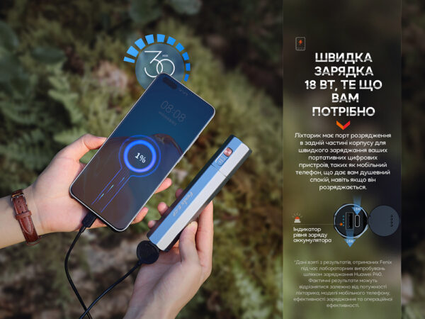 Примечание : показатели свечения модели основываются на результатах, полученных фирмой Fenix ​​во время лабораторных опытов с использованием литий-ионного аккумулятора емкостью 5000mAh при температуре 21±3°C и влажности 50% — 80%. Реальные параметры работы фонаря могут отличаться в зависимости от условий окружающей среды и аккумулятора.