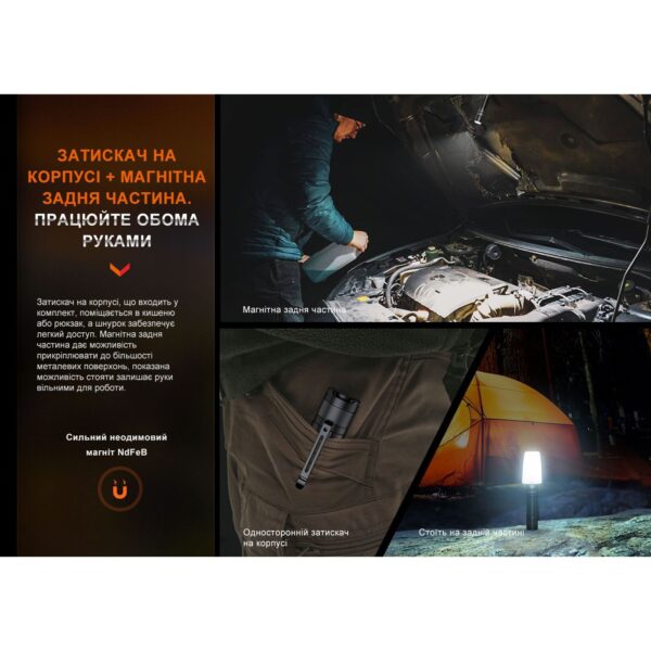 E35R удобно держать в руке, так как на корпусе имеется маленькая накатка. Модель также можно закрепить на ремне/кармане одежды с помощью съемной клипсы или зафиксировать на любой металлической поверхности с помощью магнита в хвосте, освободив руки для выполнения важных задач.