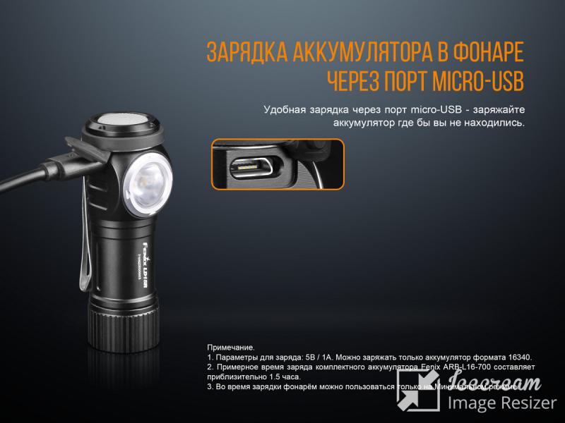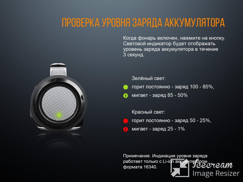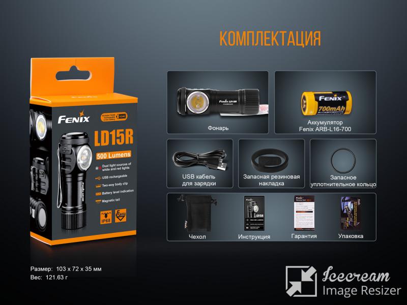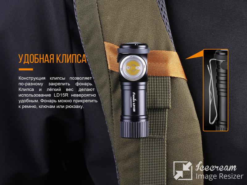 - Fenix LD15R способен работать от одного литиево-ионного аккумулятора типоразмера 16340 или от одной литиевой батарейки формата CR123;