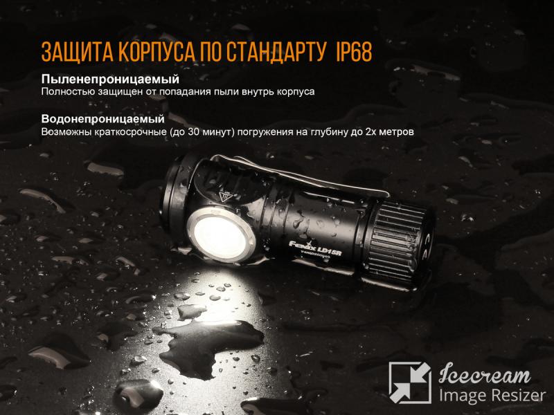 Фонарь Fenix LD15R способен работать под водой на глубине до двух метров. Подобного результата удалось добиться за счет особенностей конструкции и тщательно подгонки каждой детали друг к другу, благодаря чему пыле- и влагозащита представленного фонаря полностью соответствуют международному стандарту IP68.