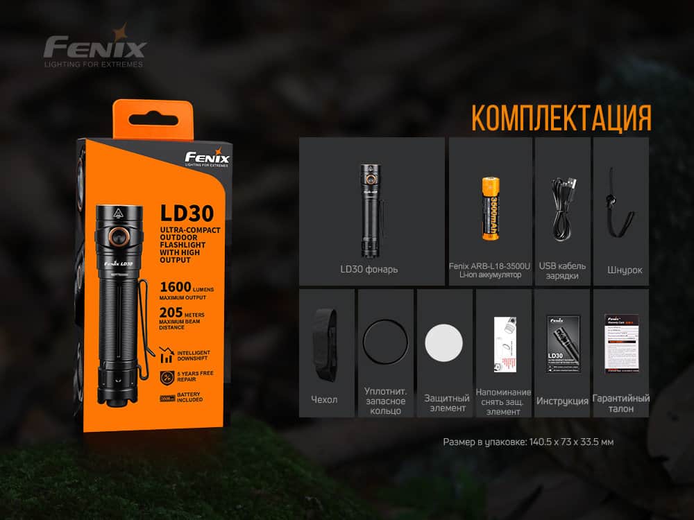 | Комплектация | Ручной фонарь Fenix LD30, li-on аккумулятор Fenix ARB18-3500U, темляк для ношения на запястье, тканевый чехол, инструкция, гарантийный талон, уплотнительное кольцо. | ||||||