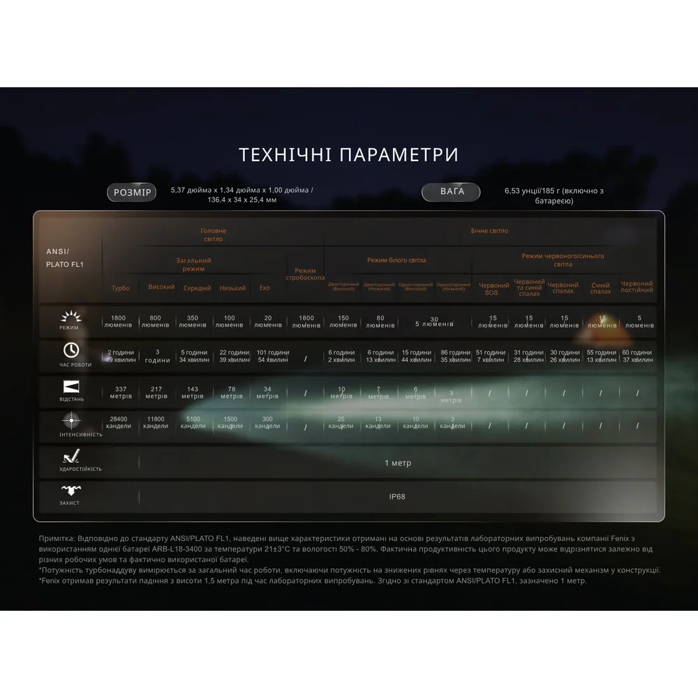 • Турбо: 1800 лм – 28400 кд – 2 часа 19 мин – 337 м;