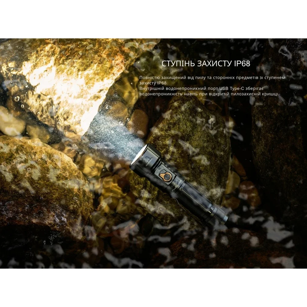 Конструкция не опасается падения с высоты 1 м и прямого контакта с влагой. Герметичность по стандарту IP68 гарантирует полную водонепроницаемость стыков с возможностью работы фонаря даже в случае погружения в воду.