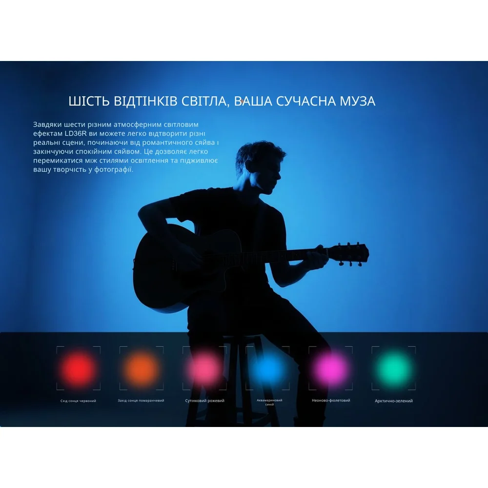 Цветные диоды излучают свет в 6 разных оттенках , позволяя настраивать освещение под текущее настроение и потребности для создания контента. Срок службы каждого светодиода составляет 50000 часов.