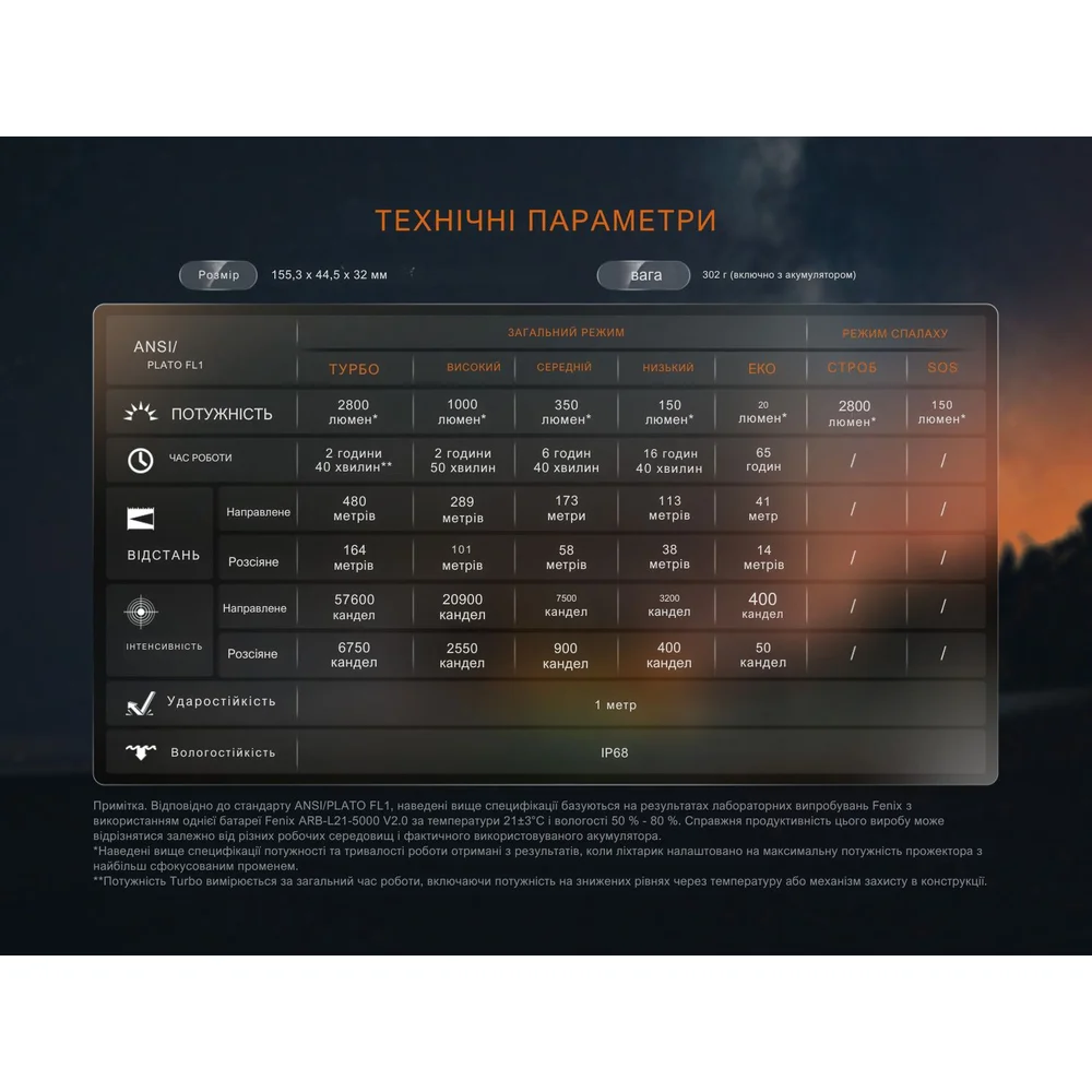 Обратите внимание, что интенсивность и дальнобойность света в каждом режиме отличается в зависимости от установленной ширины луча (для прожектора эти показатели в режиме Турбо составляют 6750 кд и 164 м, а для сфокусированного света – 57600 кд и 480 м соответственно).