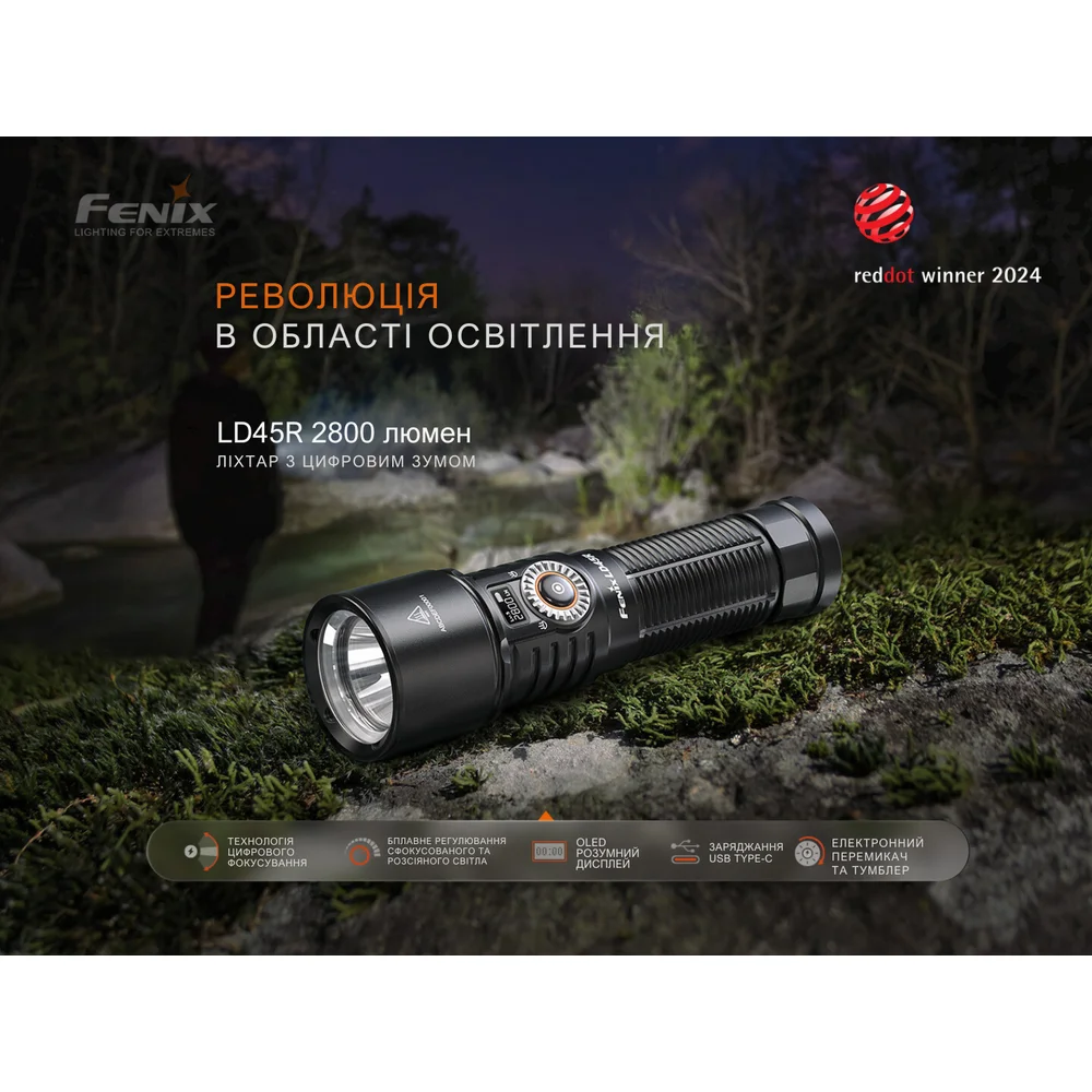 Фонарь Fenix ​​LD45R, аккумулятор Fenix ​​ARB-L21-5000 V2.0, кабель для зарядки USB Type-C, запасное уплотнительное кольцо, темляк, чехол для ношения на поясе, инструкция пользователя, гарантийный талон.