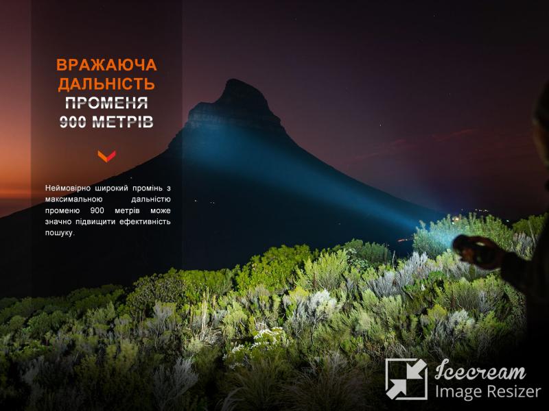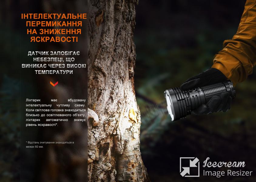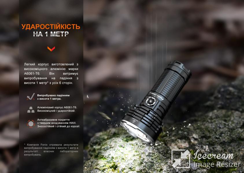 Поисковая модель LR40R V2.0 от Fenix выделяется не только яркостью света и большим набором режимов, но и ощутимо более компактными габаритами по сравнению с осветительными устройствами аналогичного типа от других производителей. Фонарь можно удерживать одной рукой, и при этом его функционал поражает наличием целых семнадцати светодиодов (1 x Luminus SFT70, 16 x Lumileds HL2X), генерирующих сверхъяркий световой поток до 15 000 люмен.