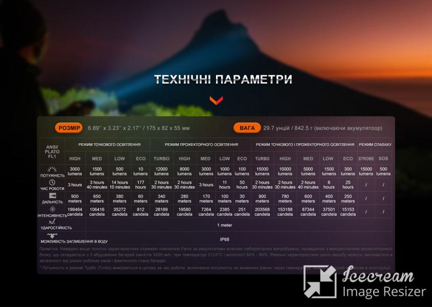 - Turbo: 15000 люмен – 203568 кандел – 2 часа 30 минут – 900 метров;