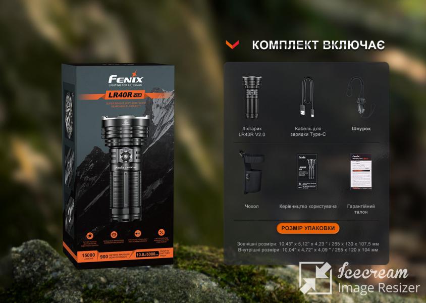 | Комплектация | Фонарь Fenix LR40R V2.0, зарядный кабель USB Type-C, чехол с возможностью фиксации на поясе, темляк, гарантия, инструкция по эксплуатации. |