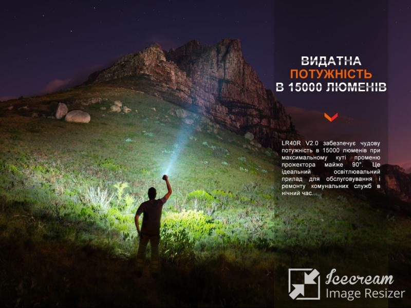 Цветовая температура освещения равна 6000K. Одним из преимуществ света холодного белого оттенка является дальнобойность, которая в данном случае составляет 900 метров. Еще одна отличительная особенность LR40R V2.0 – наличие интеллектуального датчика, автоматически снижающего мощность освещения при слишком близком нахождении фонаря от освещаемого объекта.
