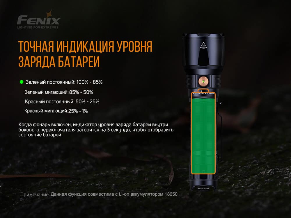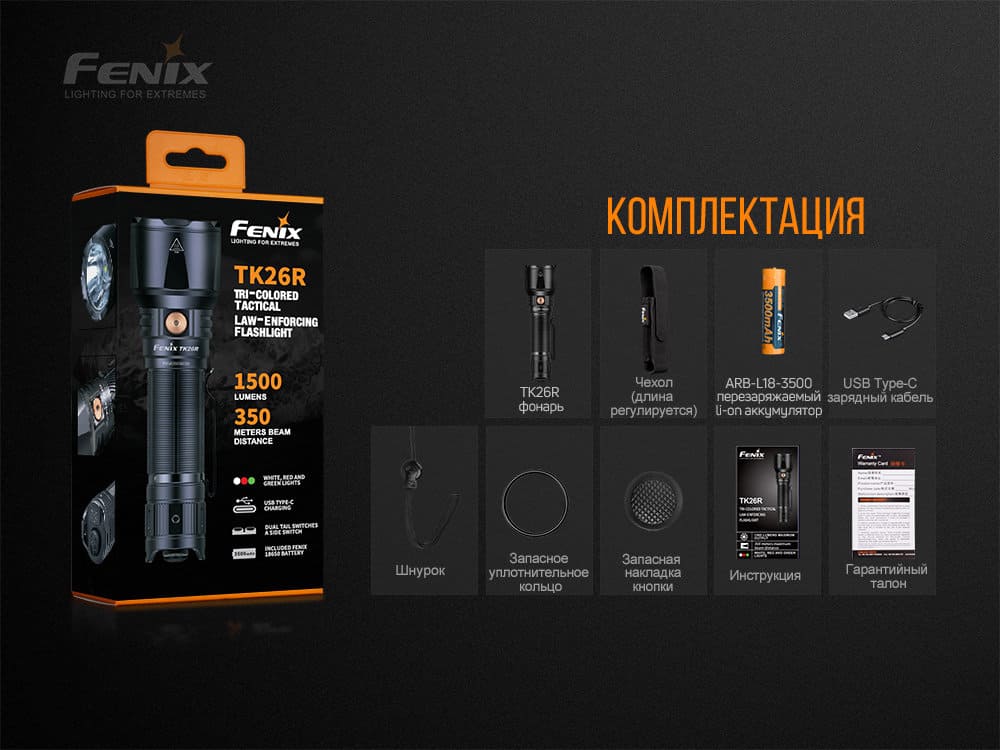 Модель фонаря Fenix TK26R, аккумулятор Fenix ARB-L18-3500, кабель USB Type-C, кабель для зарядки, ремешок на руку, чехол, запасное уплотнительное кольцо, резиновая накладка на кнопку, руководство к применению, гарантийный талон.