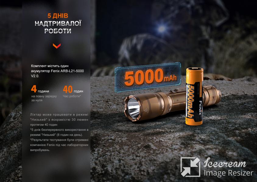 Fenix TK20R UE совместим с аккумуляторами 21700 с напряжением 3.6 В. Для питания достаточно одного элемента питания этого типа. Доступ к аккумуляторному отсеку осуществляется посредством откручивания хвостовой крышки.